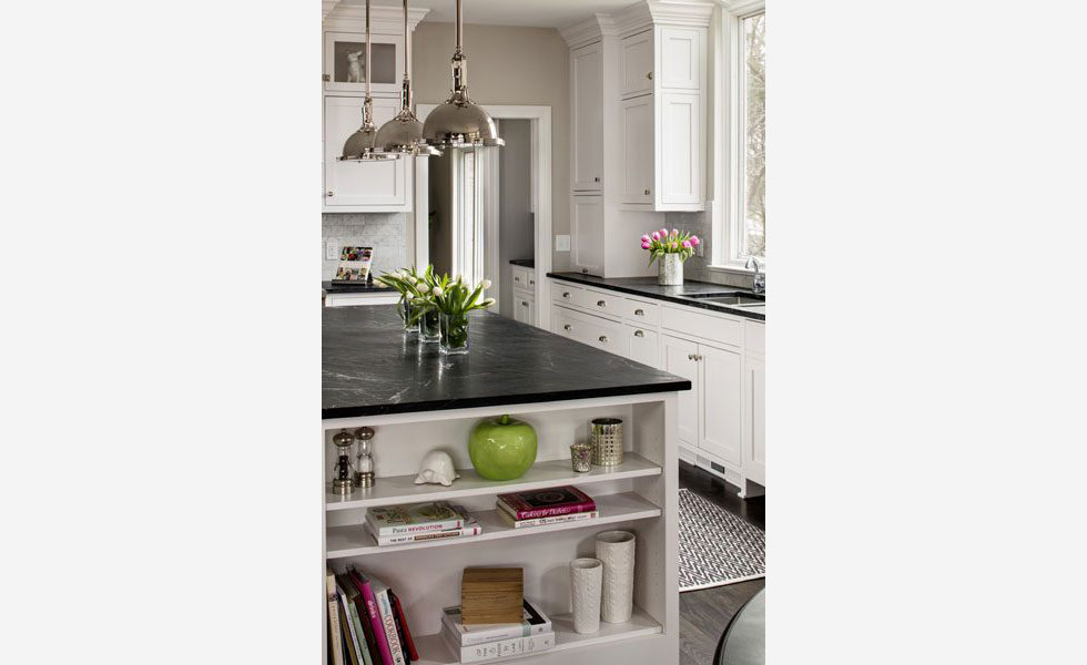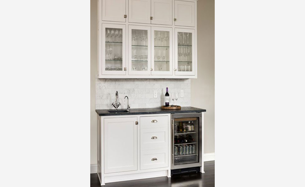 This space was designed to be bright, inviting and have a great flow. The original kitchen had older white cabinets, which stopped short of the ceiling. The new custom cabinets extend all the way to the ceiling and are met with a beautiful crown moulding. The island in the original kitchen was on a diagonal, which hampered the room’s flow. By changing the location and direction of the island, a new open layout was created. Meals can now be shared at the island or the breakfast table, creating an inviting feel. This project also boasts a sophisticated wet bar with ample storage for glassware. A marble backsplash completes the high-end look and ties the area in with the kitchen.