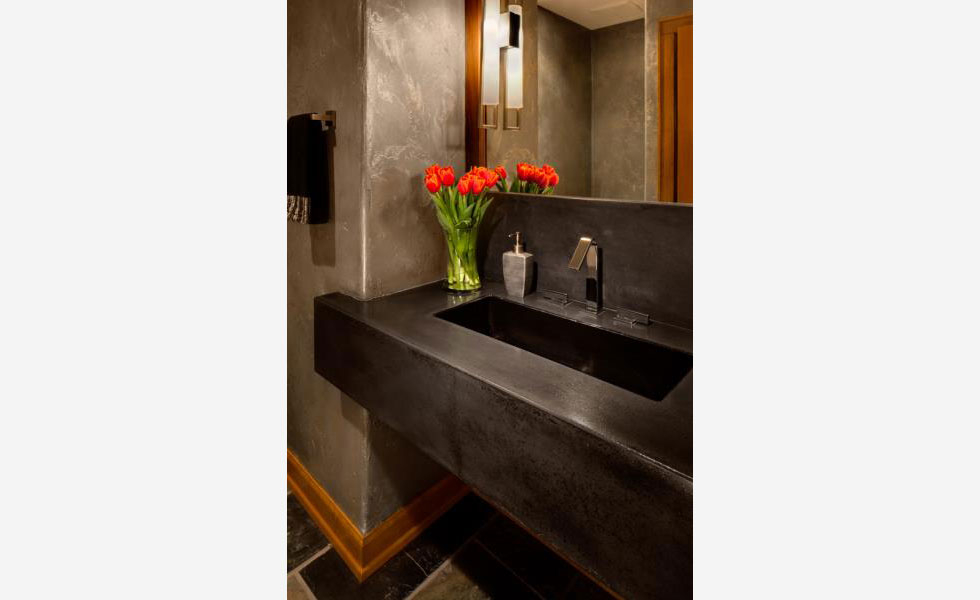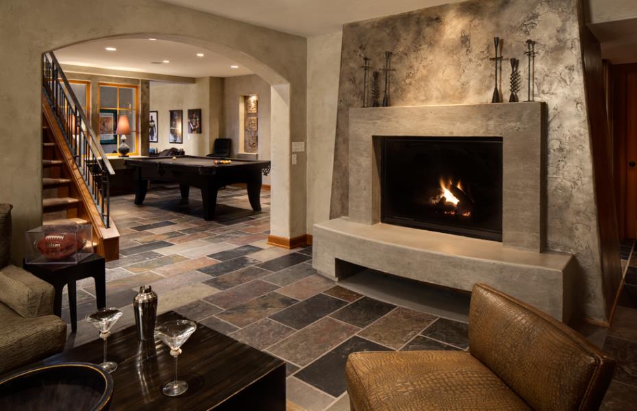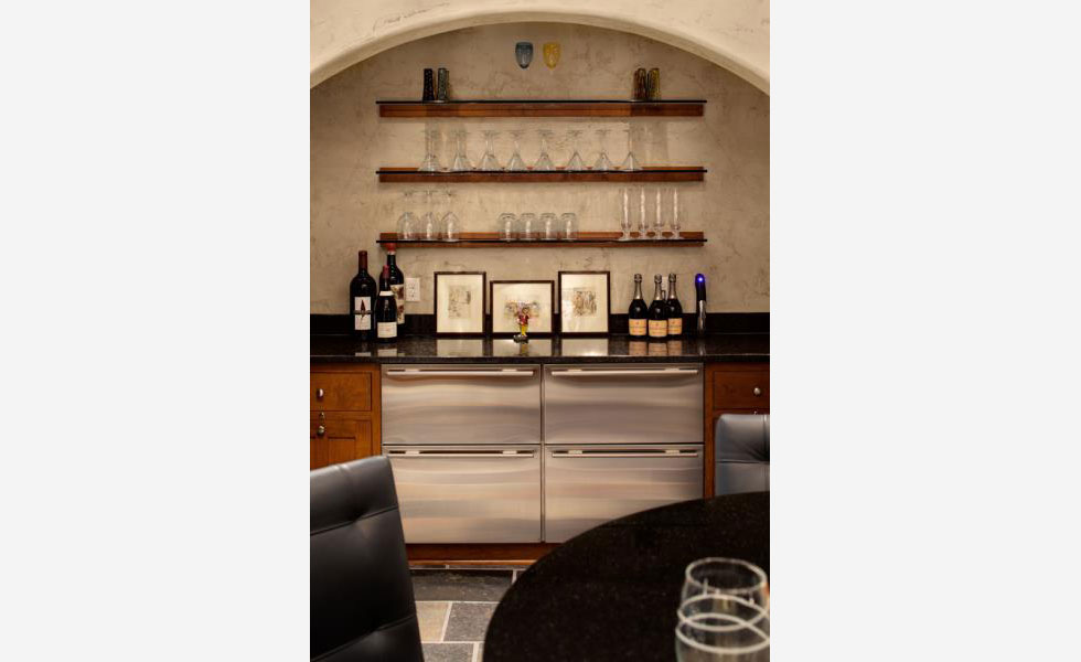 This project added the perfect entertaining space to a beautiful Brookfield home. The space includes a media room, a billiards room, a fireplace lounge, a tasting room, a wetbar and a powder room. The wine cellar is a truly unique climate-controlled 200 bottle display, creating a stunning floor-to-ceiling look. Refrigeration drawers and floating glass shelves in the wetbar enhance the tasting area’s look and functionality. The custom poured concrete hearth creates an inviting ambiance and compliments the slate tile floors.